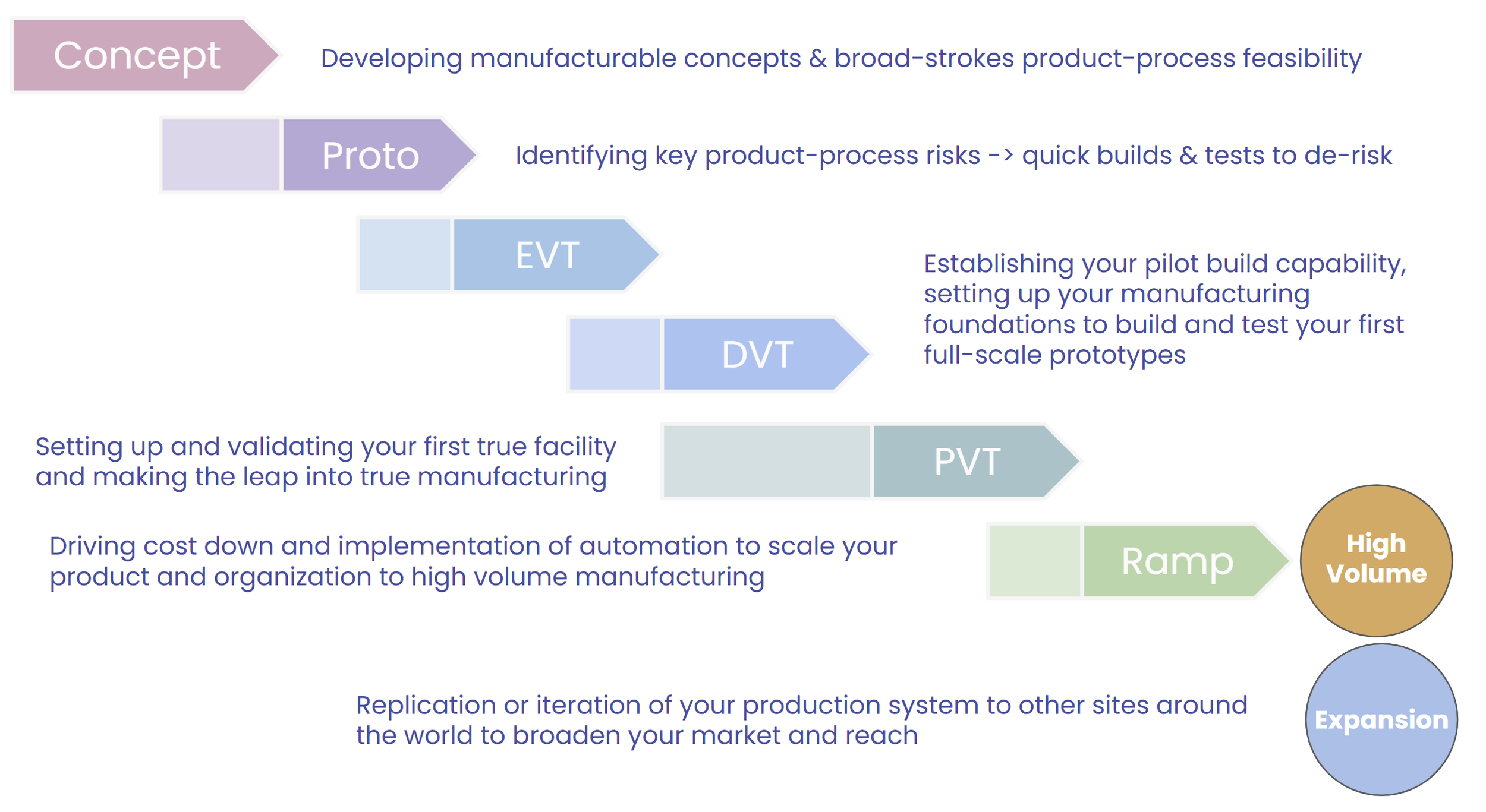 Provide direct assistance with budgeting & planning, design for manufacturability (DFM), process development, facility selection, and critical capital equipment projects